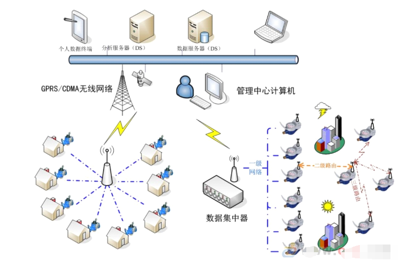 此技術(shù)使用無線水表,每塊水表作為一個終端的前提下作為中繼器,開啟自動路由功能。為其他比較遠(yuǎn)的水表提供中繼服務(wù)。